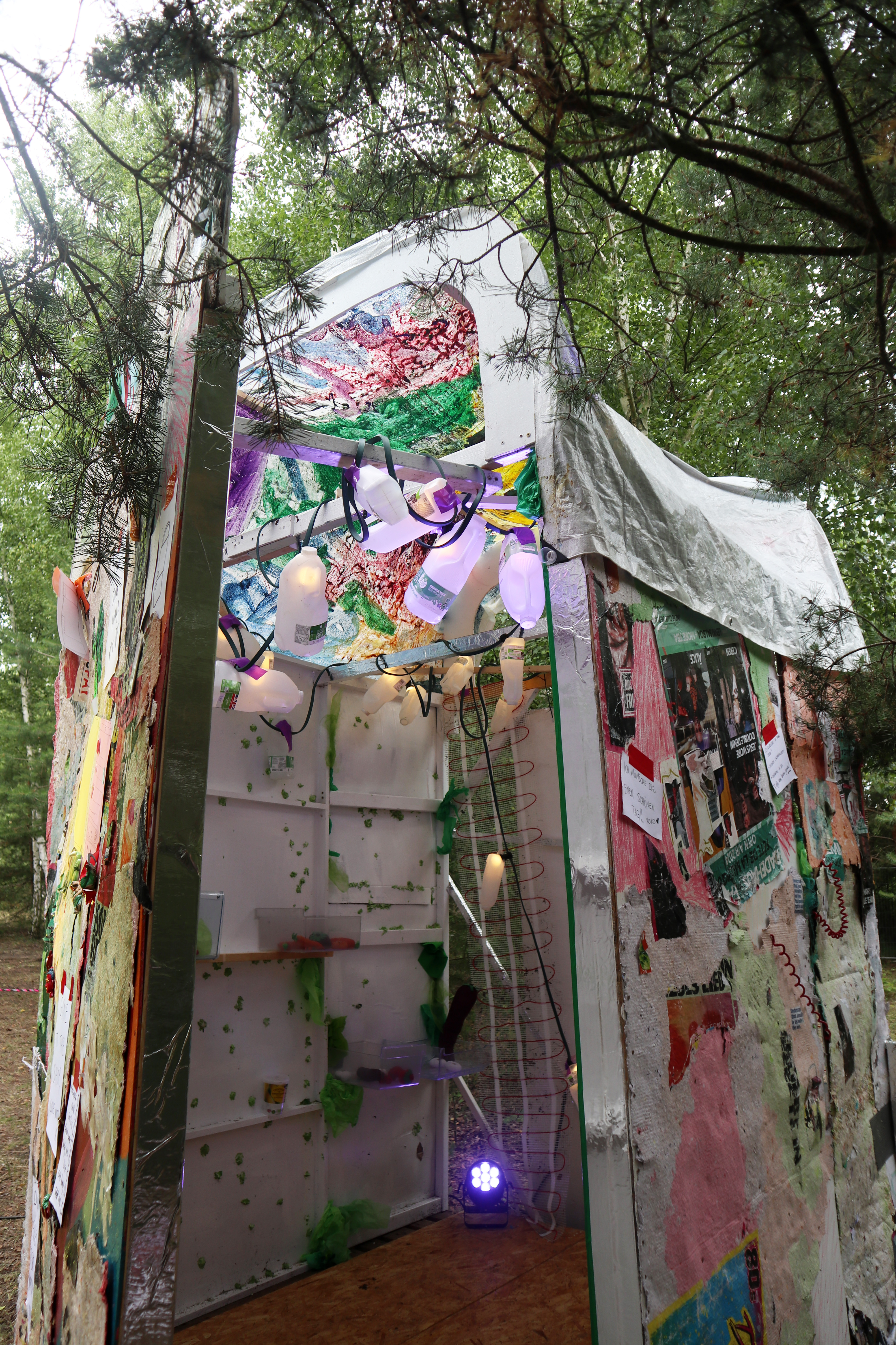 Installed into the woodlands at Ferrispolis, an old industrial site used for mining, the Mini Fridge transformed the infamous teenage bedroom accesory of the 90s into a larger-than-life structure for festival visitors to indulge in. Over the days of WHOLE festival, the fridge became moldier, stinkier and was made the home of vegetable people that guided visitors through secret missions to recieve sometimes sweet and sometimes sour offerings! This included the creation of personalised fridge magnets, free food, squishy vegetable making and eletrical waste jewellery. The sculptures walls were lined with paper pulp made from recycled party posters sourced from the layered lamposts in nearby Berlin. Drawings, notes and shopping lists were also added to the fridge door during the festival, enabling the Mini fridge to become a vehicle of reminder, message sharing and gathering through hand written communication.