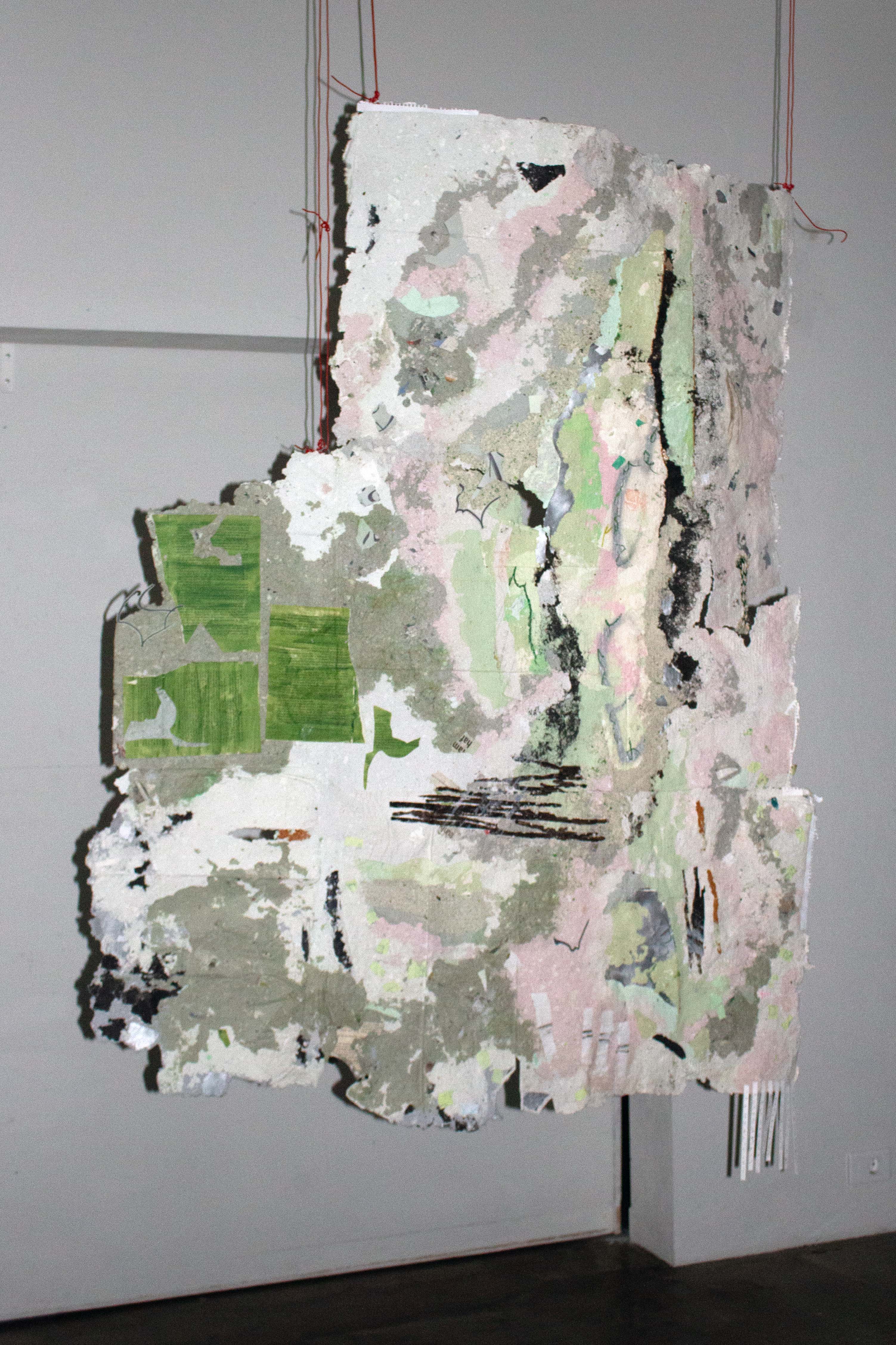 Rust, broken bike part, black sand, spray paint, icelandic book pages, donated drawings, eletrical wire