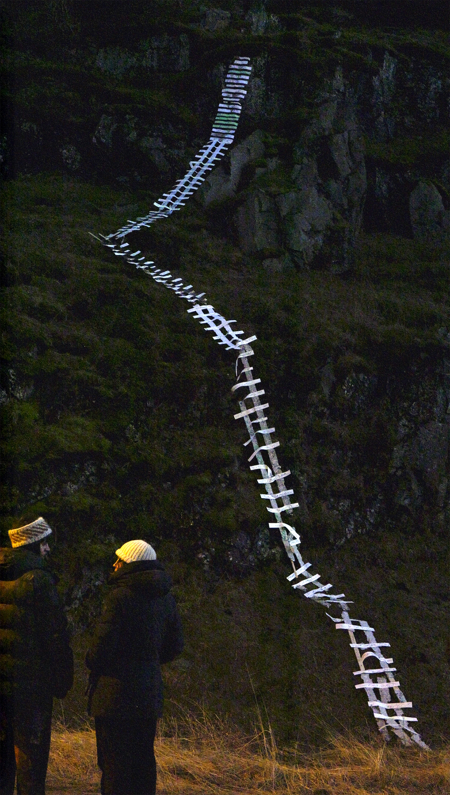 Installed in various location in Seydisfjordur, ‘Screaming steps’ is a video work that documents the growing paper ladder sculpture that elongated to 9 metres in length. Intersecting the ‘gaps’ found in everyday environments to get closer to unreachable peripheries, over 20 people installed this collapsing sculpture to reach a disused staircase at the top of a cliff face. Unable to hold the weight of a person, the sculpture performed as an unusable ladder, echoing the metal one waiting above.