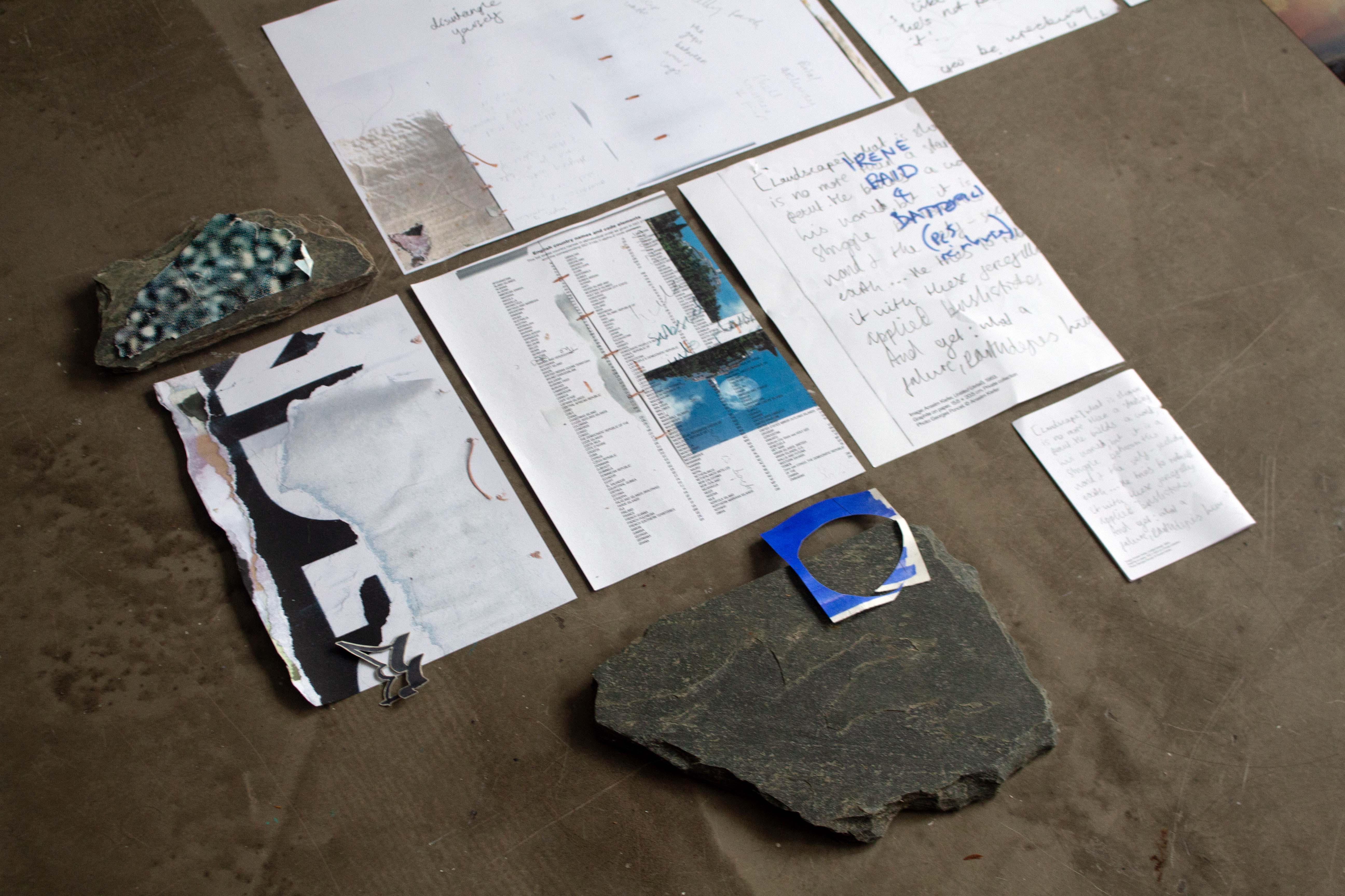 The note book is sat open, the slates are not slated here. They hold up, cushion, elevate offcuts into pearls, molluscs sucking on stone, pages are light in weight and information, Take in as much or as little as you need.